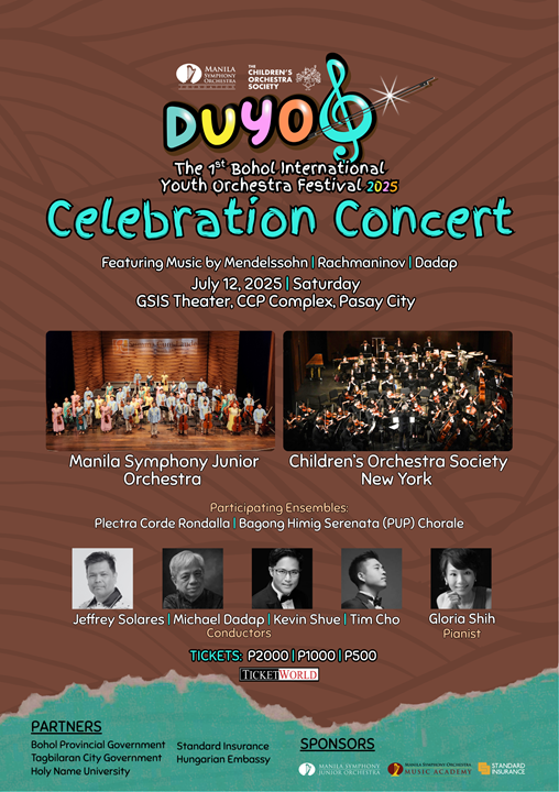 DUYOG: The 1st International Youth Orchestra Festival 2025 Celebration Concert is one of the culminating activities of the said festival, which will be held in Bohol from July 5-10, initiated between the Manila Symphony Orchestra Foundation, Inc. led by violinist and conductor Jeffrey Solares, with the Young Symphonic Ensemble (YSE) of New York’s Children’s Orchestra Society led by Filipino Classical guitarist and conductor Michael Dadap.