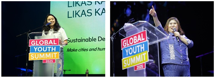 (Left photo) Winwyn Marquez advocates for gender equality at GYS 2025, encouraging youth to break barriers and uplift women in their communities.