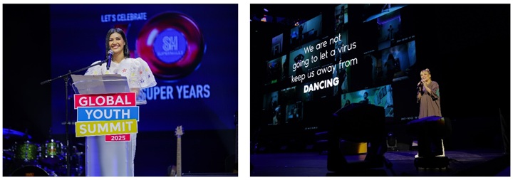 (Right photo) Jessica Soho engages youth at the Global Youth Summit 2025, encouraging them to uphold peace, justice, and integrity as pillars of strong and inclusive communities.