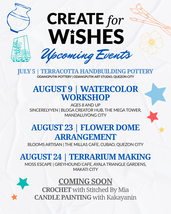 Create for Wishes kicked off this July with Odangputik’s Terracotta Handbuilding Pottery session, where participants had the opportunity to learn how to create their own clay wares. The workshop series will continue with the Watercolor Workshop hosted by SincerelyYen this August 9 at the Bloga Creator Hub in The Mega Tower, Mandaluyong City, where kids and adults aged 8 and above can experience painting for a purpose; followed by the Flower Dome Arrangement Workshop with Blooms Artisan on August 23 at The Millas Cafe, Cubao, Quezon City; and the Terrarium Making Workshop with Moss Escape on August 24 at Greyhound Cafe, Ayala Triangle Gardens, Makati City.