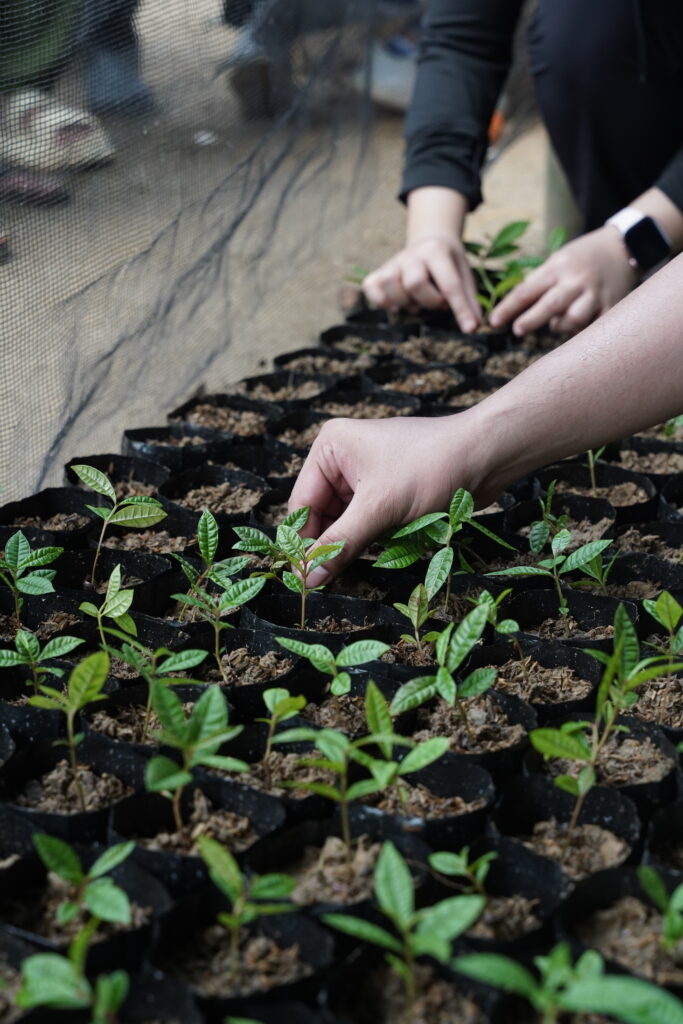 With hands on the soil, Monde Nissin volunteers prepared seedlings for growth in support of Haribon’s forest restoration efforts in Tanay, Rizal