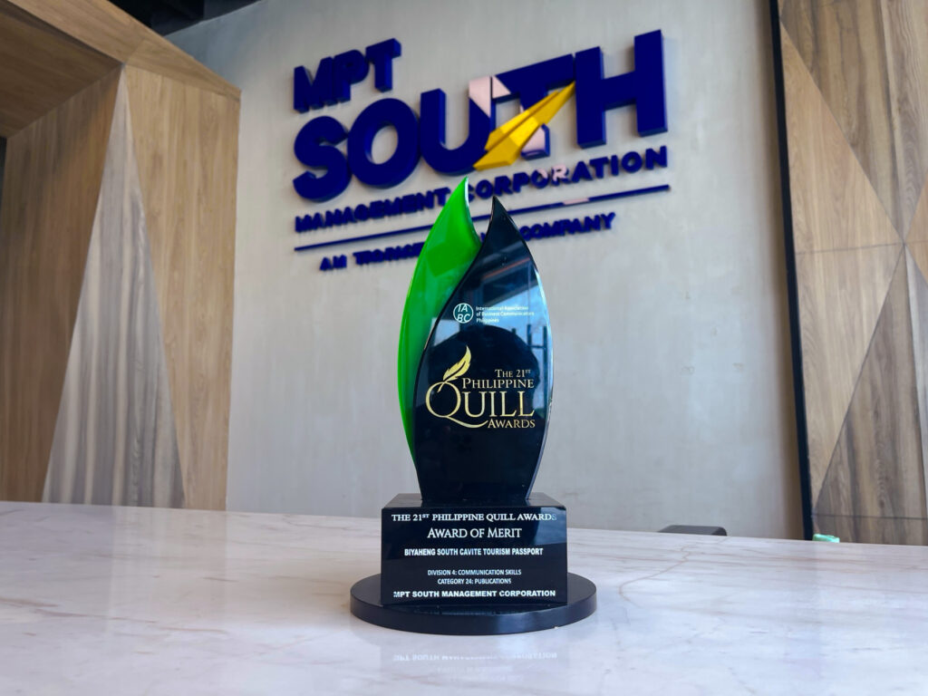 Metro Pacific Tollways South (MPT South), a unit of Metro Pacific Tollways Corporation (MPTC), proudly received the Award of Merit at the 21st Philippine Quill Awards for its ‘Biyaheng South’ Cavite Tourism Passport.