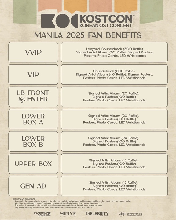 All ticket holders are entitled to numerous complementary items such as lanyards, signed posters, photo cards, and LED wristbands, depending on their designated seat sections.