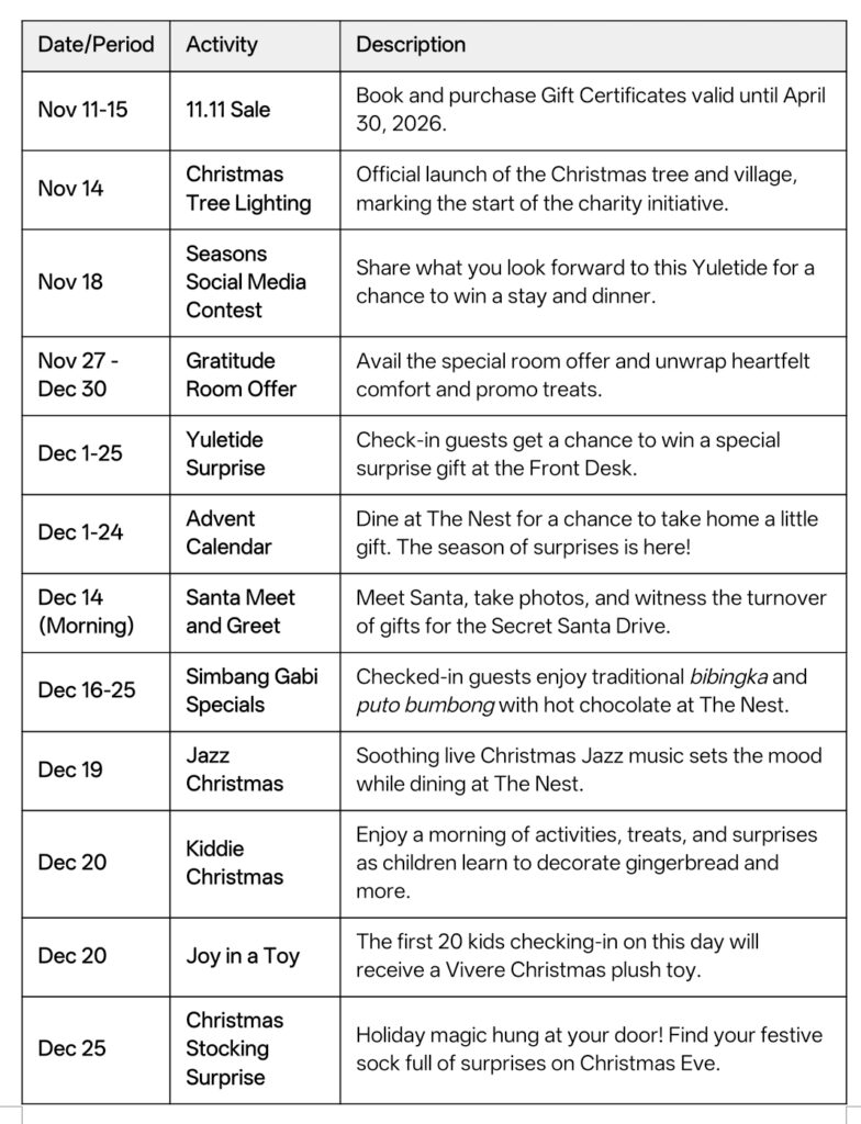 Vivere Hotel continues its meaningful tradition of holiday giving through its partnership with different elementary schools in Muntinlupa. Guests may pick a postcard at the Front Desk containing the Christmas wish of a preschool student. They may purchase the gift themselves and return it to the Front Desk or donate a minimum of 300 pesos for the hotel to purchase the item on their behalf. These gifts will be personally handed by Santa during the Santa Meet and Greet on December 14, 2025.