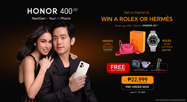 Available in stunning color options—Midnight Black, Tidal Blue and Desert Gold—the HONOR 400 5G is now available for pre-order across the Philippines for only Php 22,999 (24GB + 512GB)! Every pre-order from June 17 to 27, 2025 comes with FREE exclusive items worth ₱9,397, including a JBL Go 4 speaker, HONOR Choice Earbuds Clips, and a Jisulife Pro 1 (available only when you claim on June 28). Plus, pre-order customers get the chance to win a Rolex GMT Master II worth ₱600,000 or a Hermès Lindy Mini Bag worth ₱420,000!
