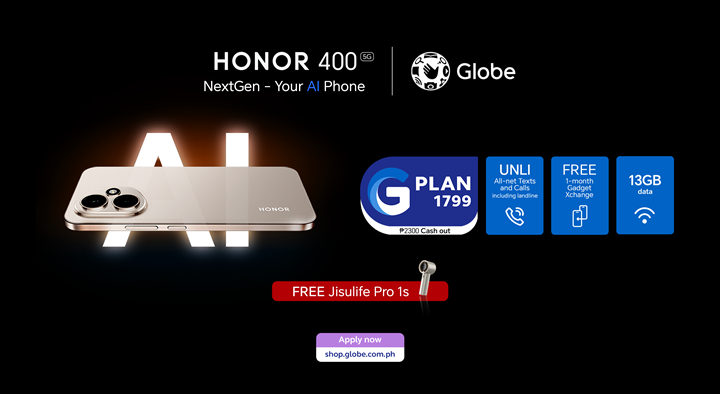 Available starting June 27, you can now visit Globe Online Shop (https://bit.ly/Globe_H400_PR) or head to participating stores to get your AI phone HONOR 400 5G starting with GPlan 1799 with Php 2,300 cashout. The mobile plan comes with 13GB Data, Unli All-net Call and Texts, Exclusive Perks and a FREE Jisulife Handheld Pro 1S.