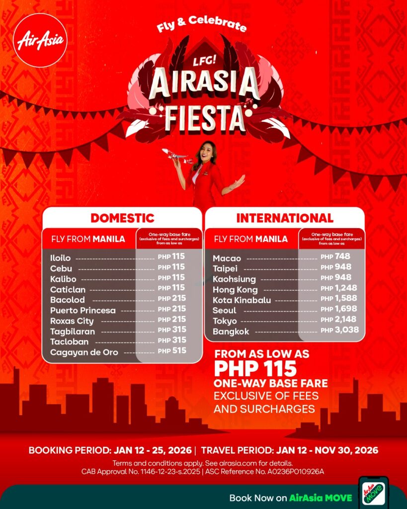 The World’s Best Low-Cost Airline is launching the AirAsia Fiesta, offering one-way base fares from just ₱115 to select domestic destinations until January 25, 2026, with travel period from January 12 to November 30, 2026, making it easier than ever for Filipinos to join the country’s most anticipated cultural celebrations or plan their future travels.