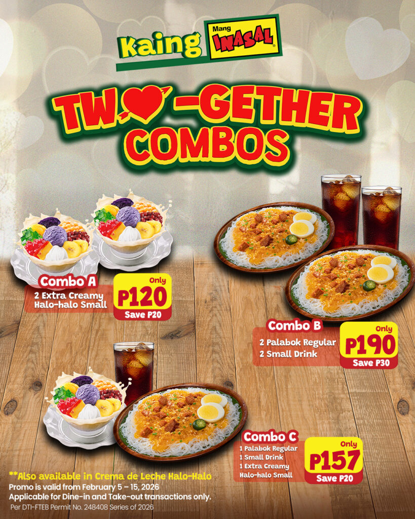 The TWO-gether Combos feature carefully paired favorites that highlight Mang Inasal’s trademark sarap at sulit experience. Combo A’s two small Extra Creamy Halo-Halo or Crema de Leche sell for only P120; Combo B’s two regular Palabok and 2 small drinks (Soft drinks, Lipton Iced Tea, or Red Gulaman) cost P190; and Combo C’s regular Palabok, small Extra Creamy Halo-Halo or Crema de Leche, and small drink are priced at P157. All three combos are available for dine-in and take-out only, until Feb. 15.