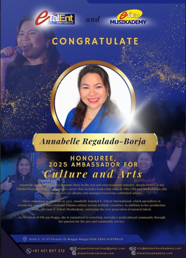 Annabelle Regalado-Borja’s influence in 2025 was recognized on multiple fronts. She was named 2025 Ambassador for Culture and the Arts by ACI Central and NARRA, and honored as a Top 4 Finalist for the Triple M People’s Choice Award at the 2025 Golden Crow Awards in Wagga Wagga. These accolades reflect not only her professional excellence, but her role as a cultural bridge, uniting artistry, community, and opportunity.